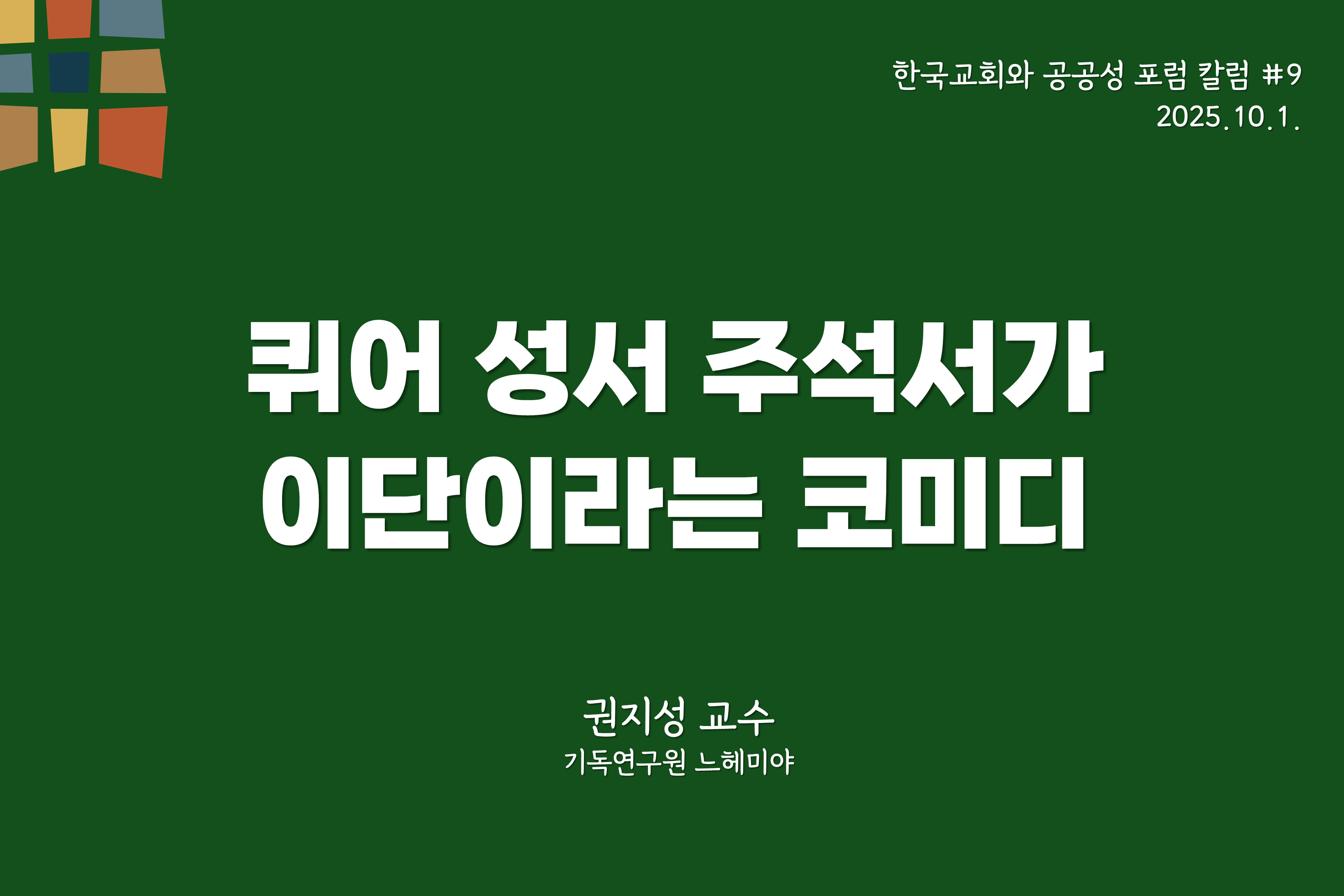 예장통합의 “퀴어 성서주석” 이단 결의는 세 가지 측면에서 비판받아 마땅하다. 첫째, 성서 해석의 자유를 제도적으로 제약하면서도 목회자 세습 문제와 전광훈 관련 사안에는 상대적으로 관대한 이중 잣대를 보였다는 점이다. 학문에는 철칙을 들이대지만, 전광훈이라는 권력에는 관대하다. 이 결정이야말로 코미디 아닌가? 둘째, 21세기 대명천지에 학문·인권 환경과 어긋난 시대착오적 결정으로 국제 학계와 시민사회에서 조롱의 대상이 된다는 점이다. 오늘날의 사회문화적 윤리 기준(인권, 차별금지, 학문·표현의 자유)에도 미달하는 구태의연한 교리주의로 최소한의 개인 인권 감수성에도 어긋난다는 점이다. 셋째, 980명 중 15명만이 반대표를 던졌으니, 1.5%에 해당하는 숫자이다. 압도적인 다수가 퀴어 주석서를 이단으로 규정한다는 애기다. 기가찬다. 나는 실제 통합 교단의 많은 목회자들이 퀴어 문제에 대해서 교단과 다른 생각을 가지고 있을 것이라 생각한다. 그런데 통합 내부의 의식있는 목회자·신학자들이 이것이 잘못임을 알면서도 침묵으로 동조하는 풍토가 자기모순적이며 우스꽝스럽다. 결국 이는 “당신들은 왜 신학을 공부하는가—진리를 사랑하기 위해서인가, 안전한 커리어를 위해서인가?”라는 뼈아픈 질문을 피할 수 없게 만든다.