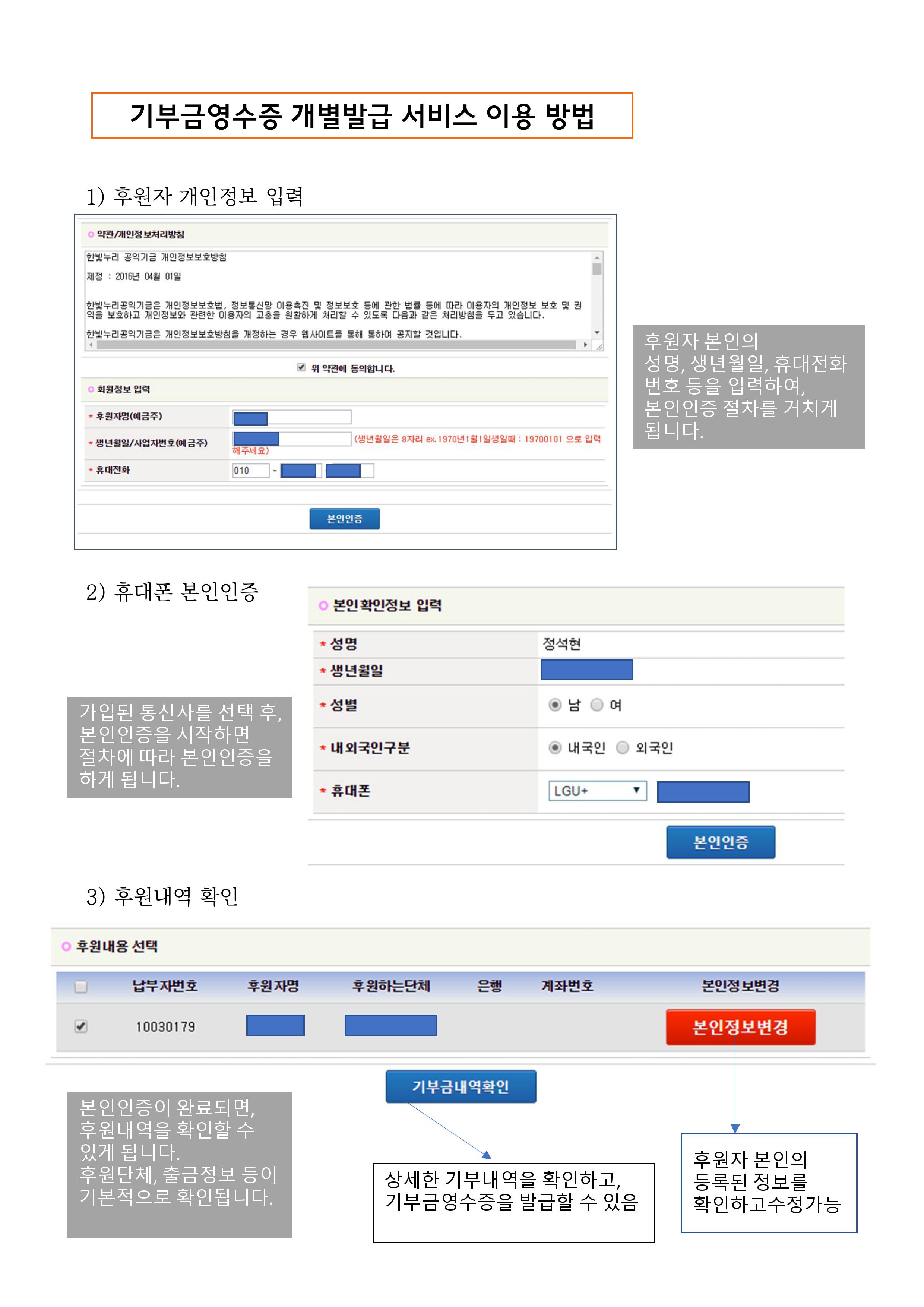 확인 필요 정보 : 후원자 성명, 주민등록번호, 기부금영수증수령주소, 후원내역